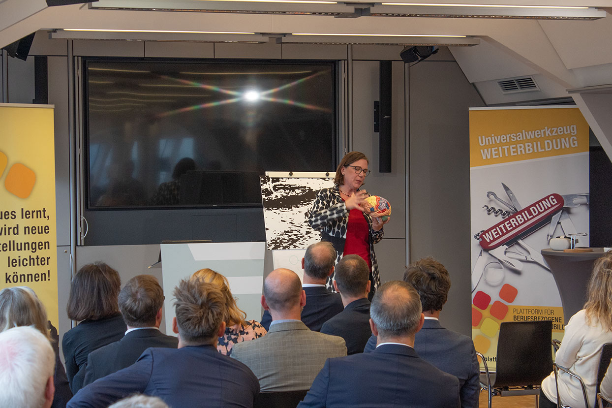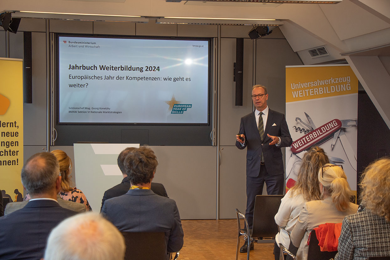 Besonders bereichert wurde die Veranstaltung durch die Vorträge unserer Referent:innen: Sektionschef Georg Konetzky beleuchtete in seinem Impuls „European Year of Skills“, welche Maßnahmen ergriffen werden, um den Arbeits- und Fachkräftemangel langfristig und nachhaltig zu bekämpfen. Dr. Katharina Turecek faszinierte das Publikum mit ihrer Keynote „Weiterbildung sichtbar machen“, in der sie eindrucksvoll erklärte, wie das menschliche Gehirn Wissen aufnimmt und wie diese Erkenntnisse gezielt für die Entwicklung von Kompetenzen genutzt werden können.